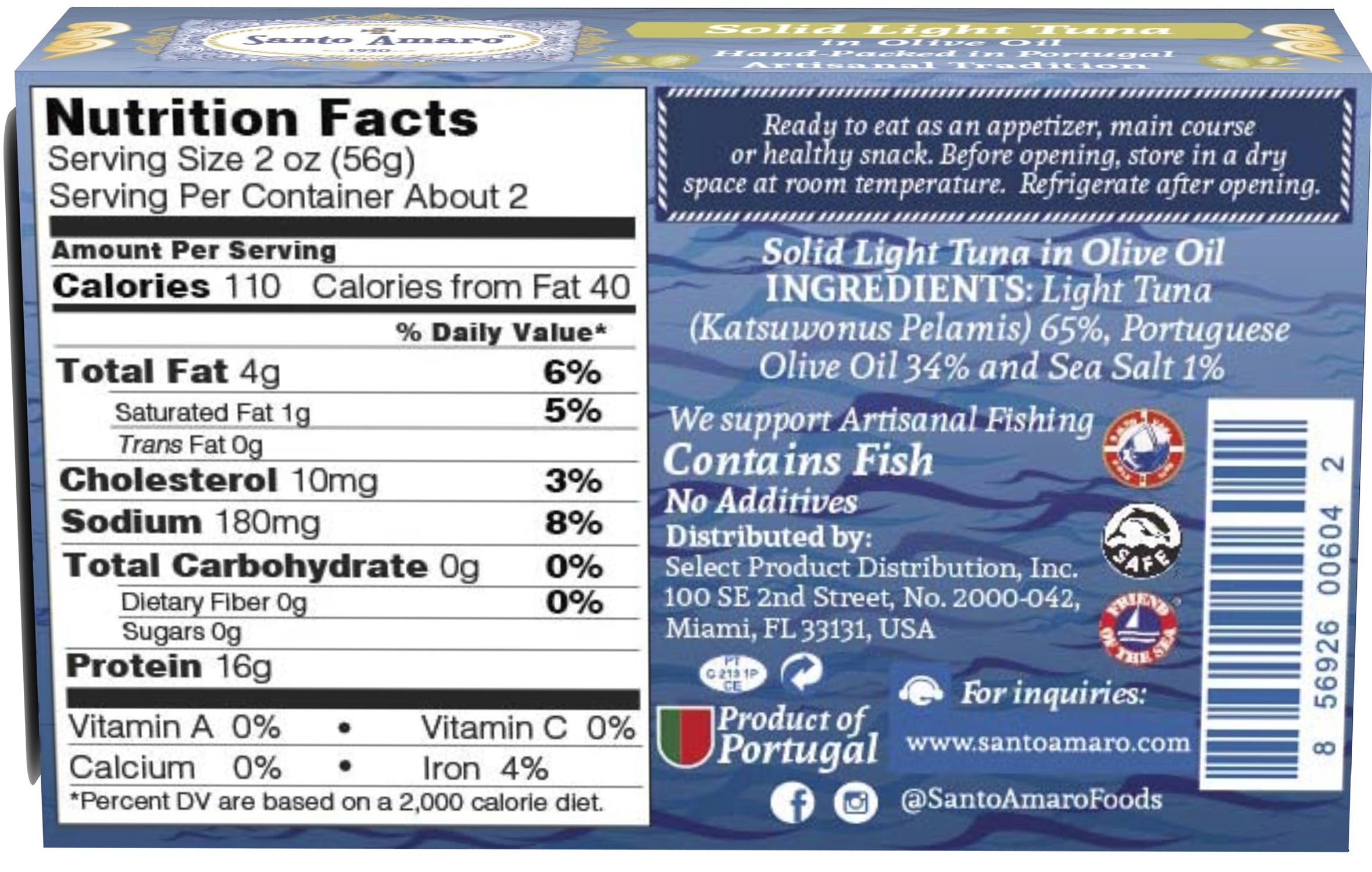 POLE & LINE CAUGHT SOLID PACK LIGHT WILD TUNA FILLETS IN PURE PORTUGUESE VIRGIN OLIVE OIL– FROM PORTUGAL: EUROPE STYLE! Fantastic tasting! Highest quality natural and pure ingredients! Best for traditional artisanal communities! Best for your family! Best for our Oceans! Santo Amaro – Artisanal Tradition - You'll taste the difference! ATLANTIC WILD SKIPJACK (KATSUWONUS PELAMIS) SOLID LIGHT TUNA FILLETS HAND PACKED IN PORTUGAL